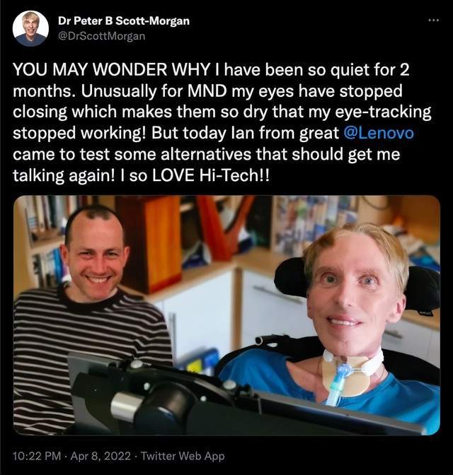 彼得还需要一个能让他自如输出想法的解决方案,毕竟,手指移动能力也是他终将告别的东西之一。