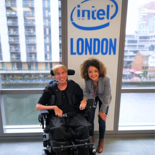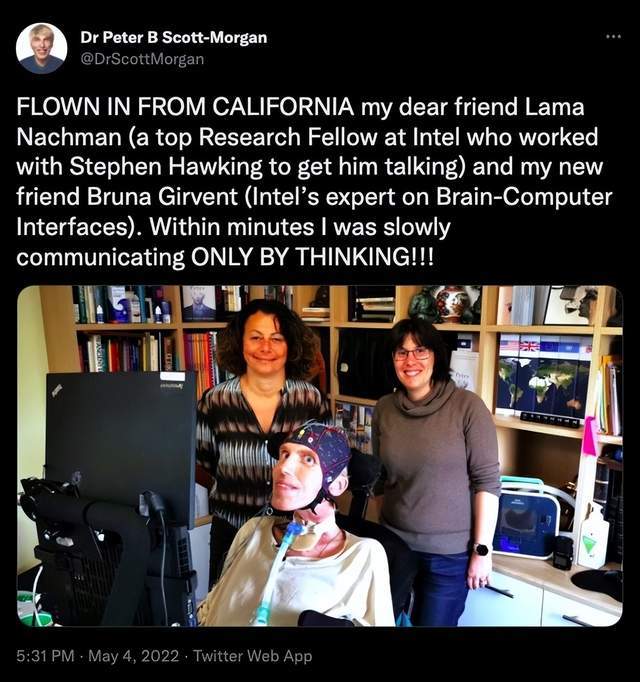5 月 4 日,Nachman 带着英特尔的脑机接口专家 Bruna Girvent 探望彼得,合照中的他戴上了脑机接口设备,正在体验意念沟通。
